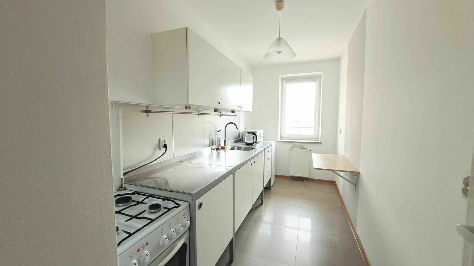 Kuchnia: Płytki, częściowo płytki na ścianach, pełna zabudowa kuchenna, lodówka, mikrofala, kuchenka gazowa, okno PCV