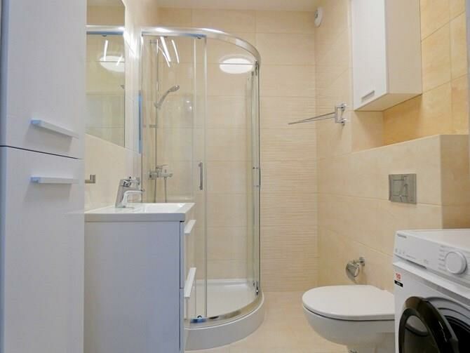 Łazienka: kabina prysznicowa, umywalka, WC, pralka, 3 szafki.