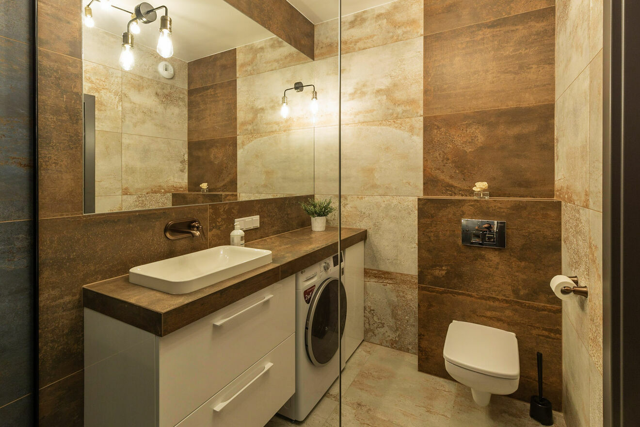 -łazienka: prysznic, WC, duża szafka pod umywalką, pralko-suszarka
