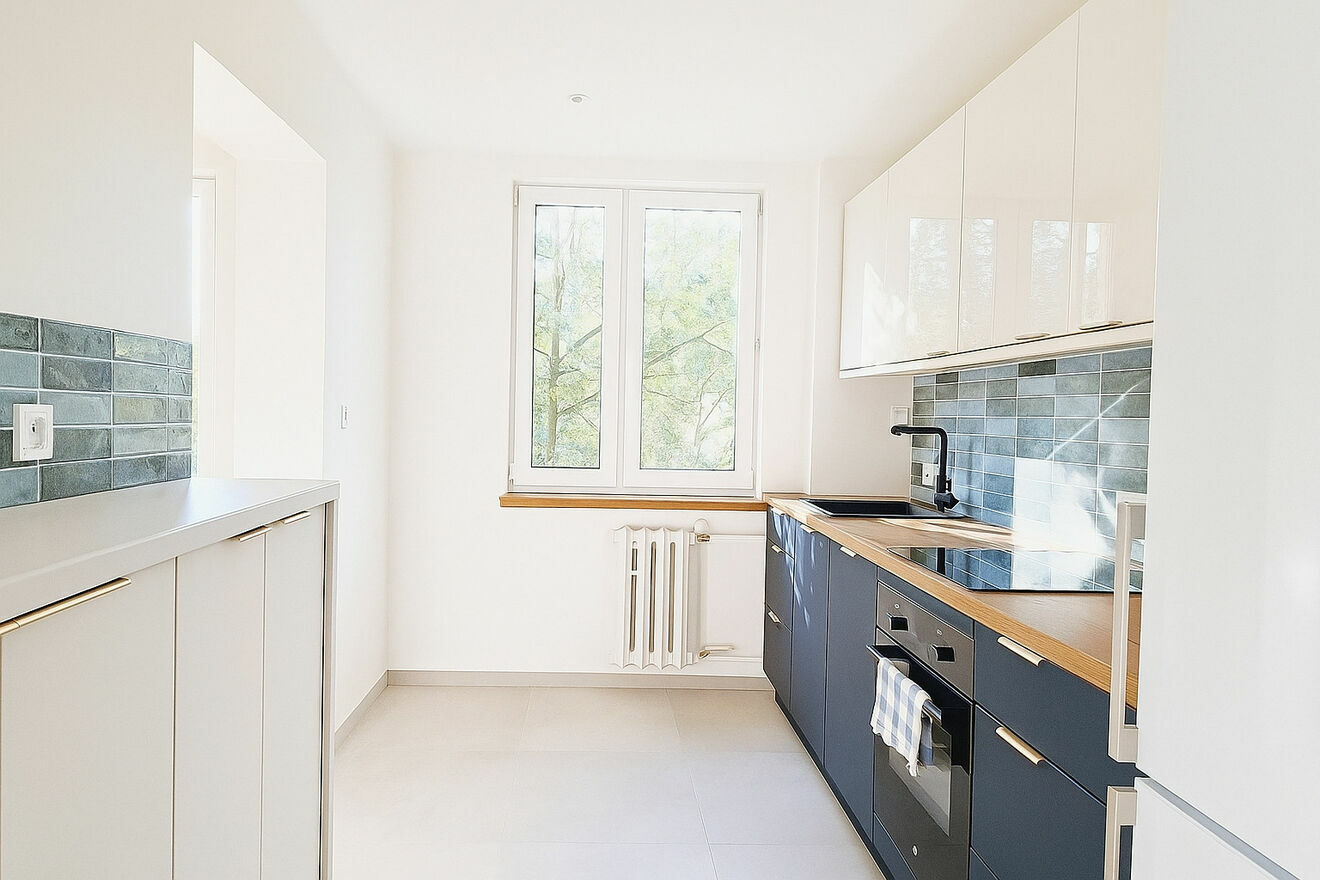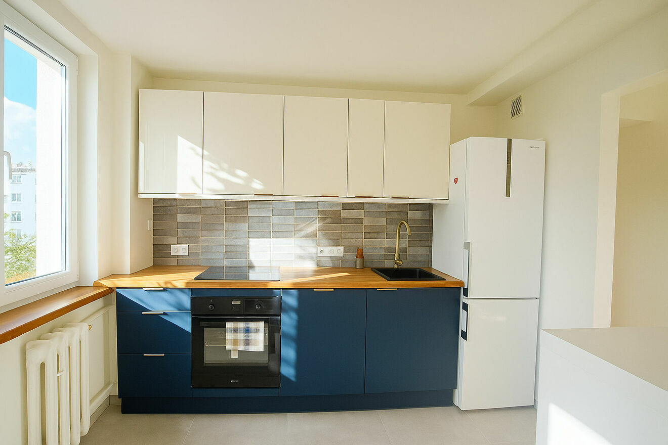 nowoczesna zabudowa kuchenna ze sprzętami (lodówka, piekarnik, płyta, zmywarka)