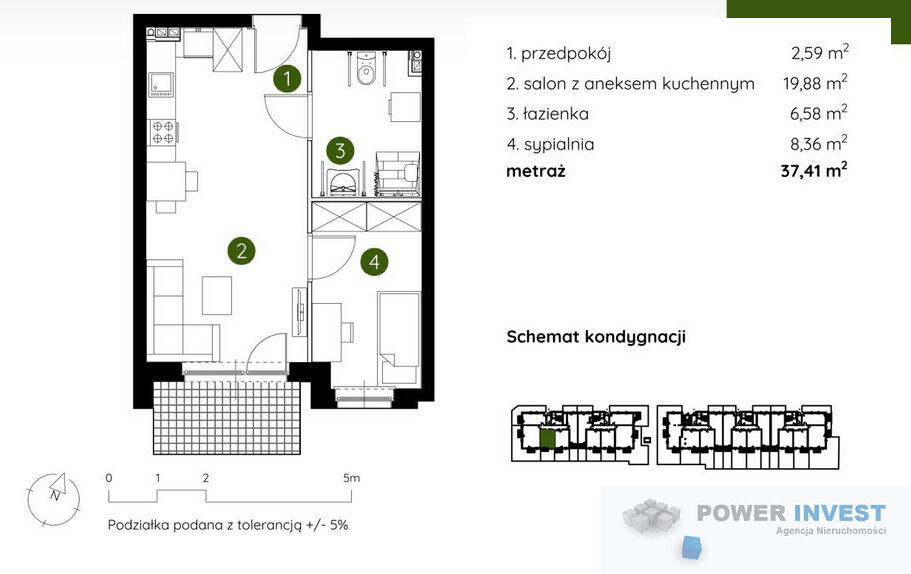 Mieszkanie znajduje się na 3 piętrze. Lokal ma powierzchnię 37,41