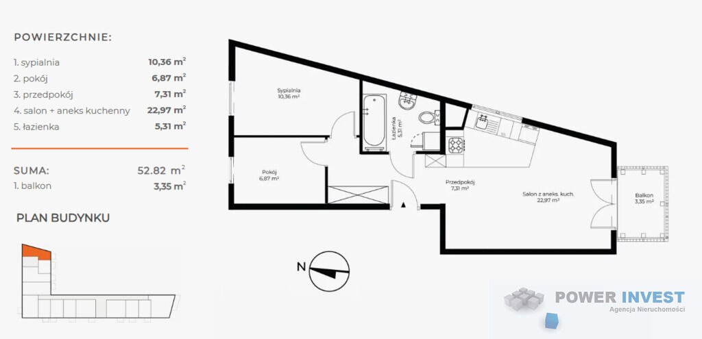Lokal znajduje się na 3 piętrze, ma powierzchnię 52,82 m2 i składa