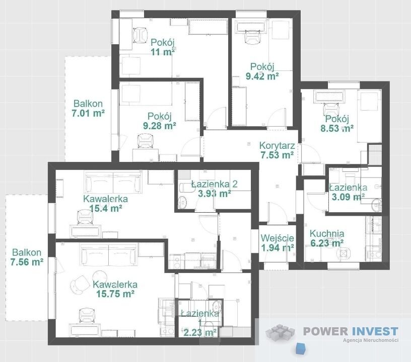 Dwa balkony: 7.01m2 oraz 7.56m2.