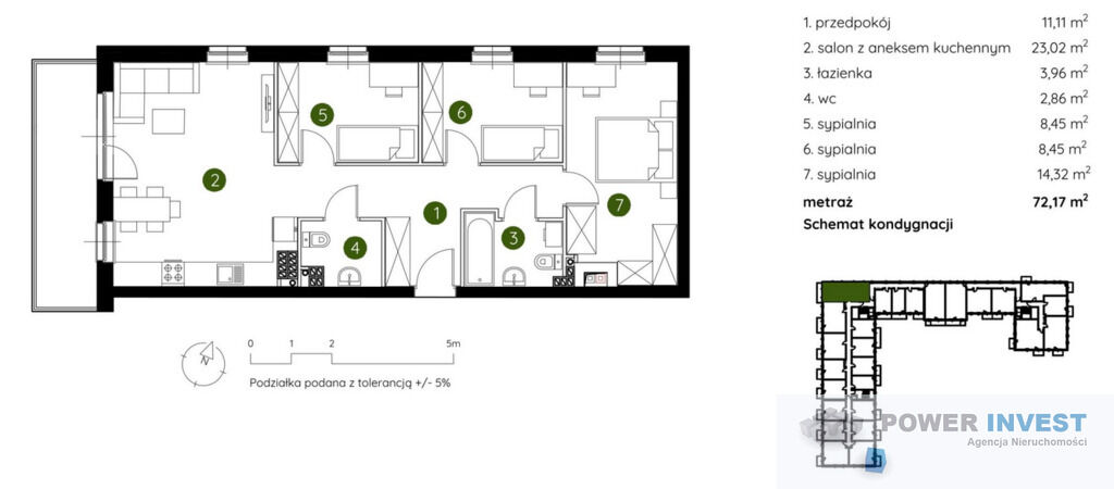 Mieszkanie znajduje się na 3 piętrze. Lokal ma powierzchnię 72,17