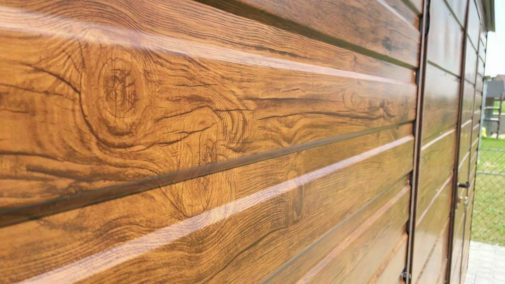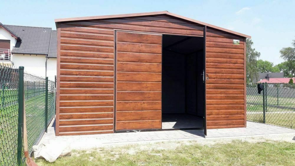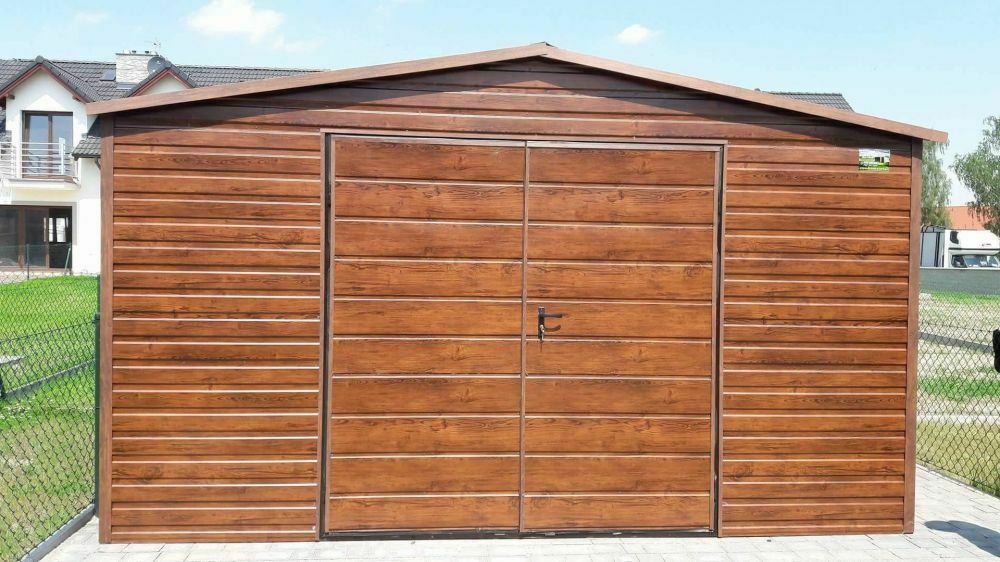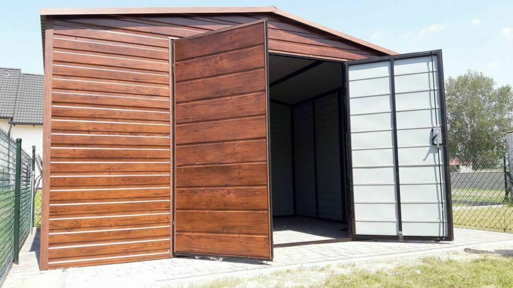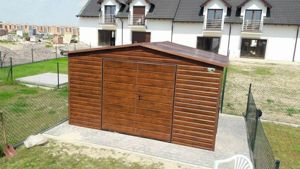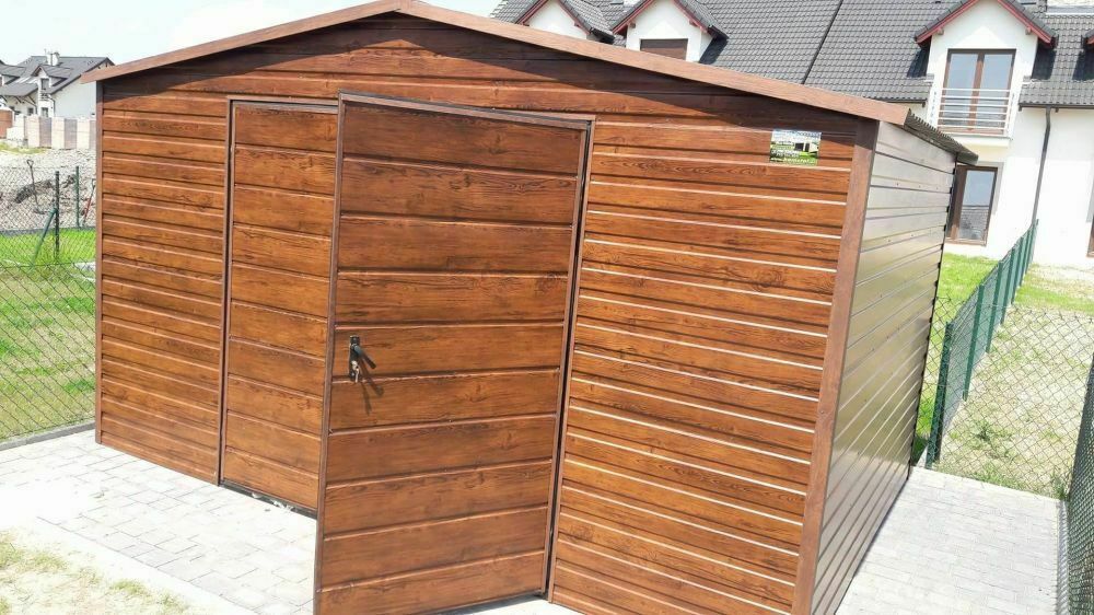 Garaż blaszany/ Domek ogrodowy w kolorze ORZECH MAT. Dach pokryty jest blachą trapezową T14.Konstrukcja w całości wykonana z profilu zamkniętego ocynkowanego 30x30.