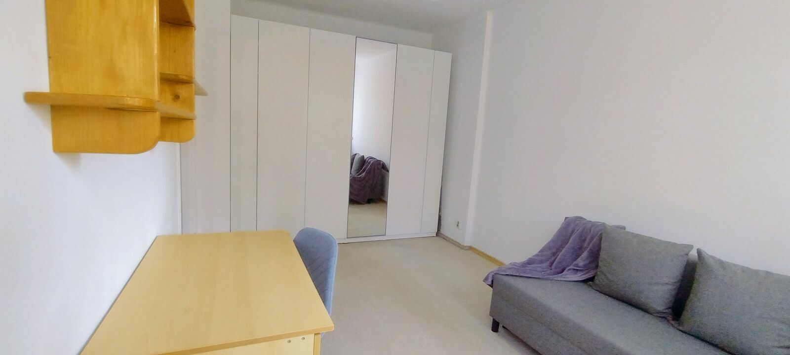 nowa duża szafa, biurko, półki, sofa z funkcją spania, meble kuchenne, lodówka.
