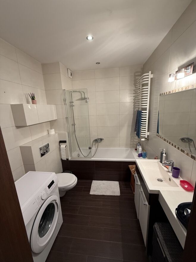 łazienka: wanna z prysznicem, pralka, umywalka, szafka łazienkowa, lustro