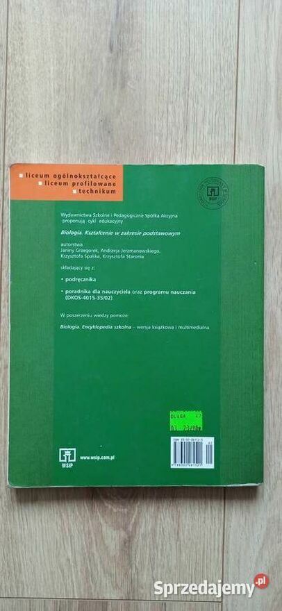 Książka "Biologia - podręcznik" kształcenie w zakresie podstawowymAutorzy: Janina Grzegorek, Andrzej Jerzmanowski, Krzysztof Spalik, Krzysztof Staroń. Pod redakcją Andrzeja Jerzmanowskiego