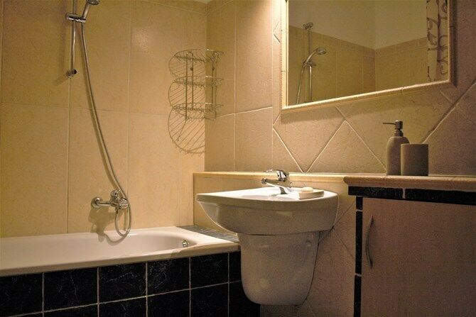 Łazienka: wanna, pralka, umywalka z lustrem.