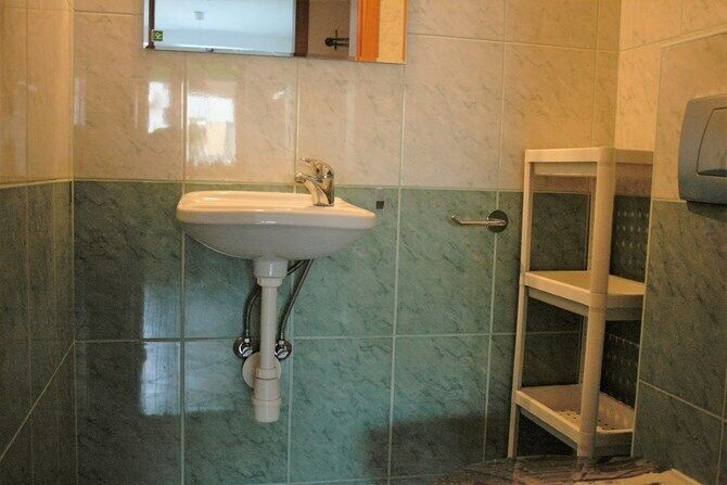 Toaleta: osobne pomieszczenie z umywalką i lustrem.