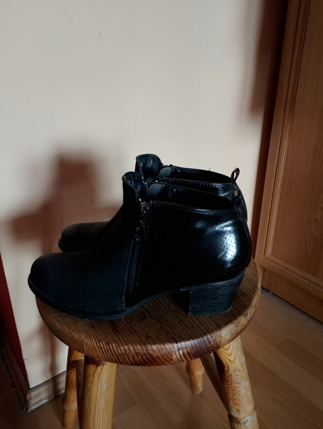 Buty damskie na obcasie Rozmiar 38.kolor czarny.Ozdobny zamek z boku butów.Jedna strona buta zamsz,druga strona skóra.Buty na zamek błyskawiczny.Mozliwy odbiór osobisty KrakówJolka