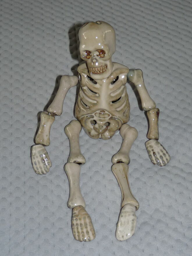 Mam do sprzedania ceramiczną figurkę (lampkę) w kształcie kościotrupa na Halloween. Z tyły znajduję się otwór na świeczkę typu tealight.Wszystkie elementy ("kości") połączone są elastycznym drutem, więc figurkę można dowolnie ustawiać w pozycji siedzącej