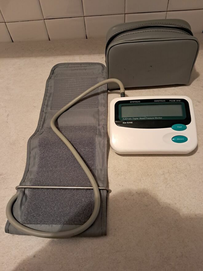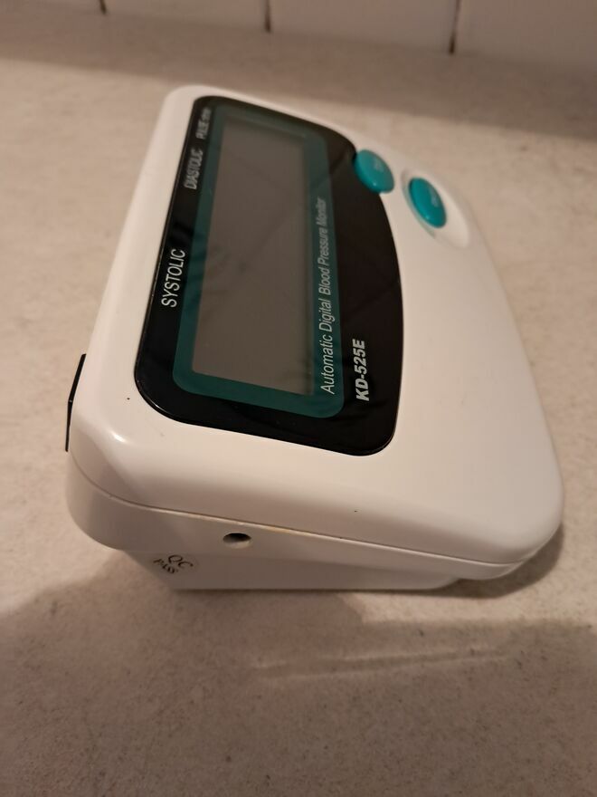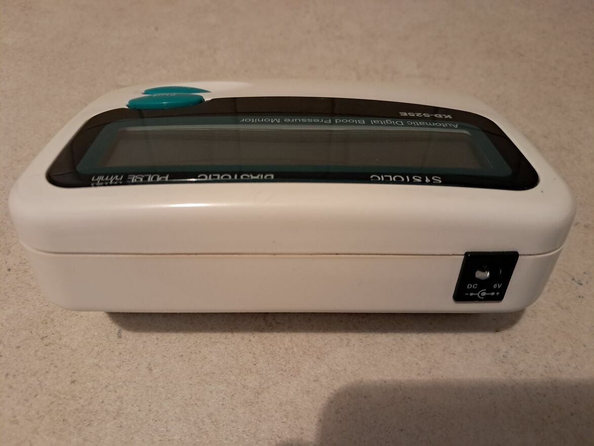 Do sprzedania automatyczny cyfrowy ciśnieniomierz, model KD-525E, wyświetlający ciśnienie krwi skurczowe, rozkurczowe oraz tętno, zasilany czterema bateriami R6 (zwykłe paluszki). Przeznaczony do samodzielnego pomiaru (ramię górne) i użytku domowego. W zestawie etui (niestety z niesprawnym suwakiem) o wymiarach w cm: 17,5 x 12,5 x 6.Sprzęt w dobrym stanie, sprawny.