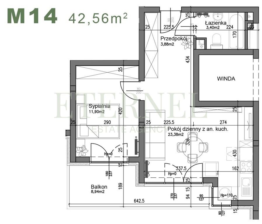 23,38 m2 z wyjściem na balkon. W części prywatnej znajduje się