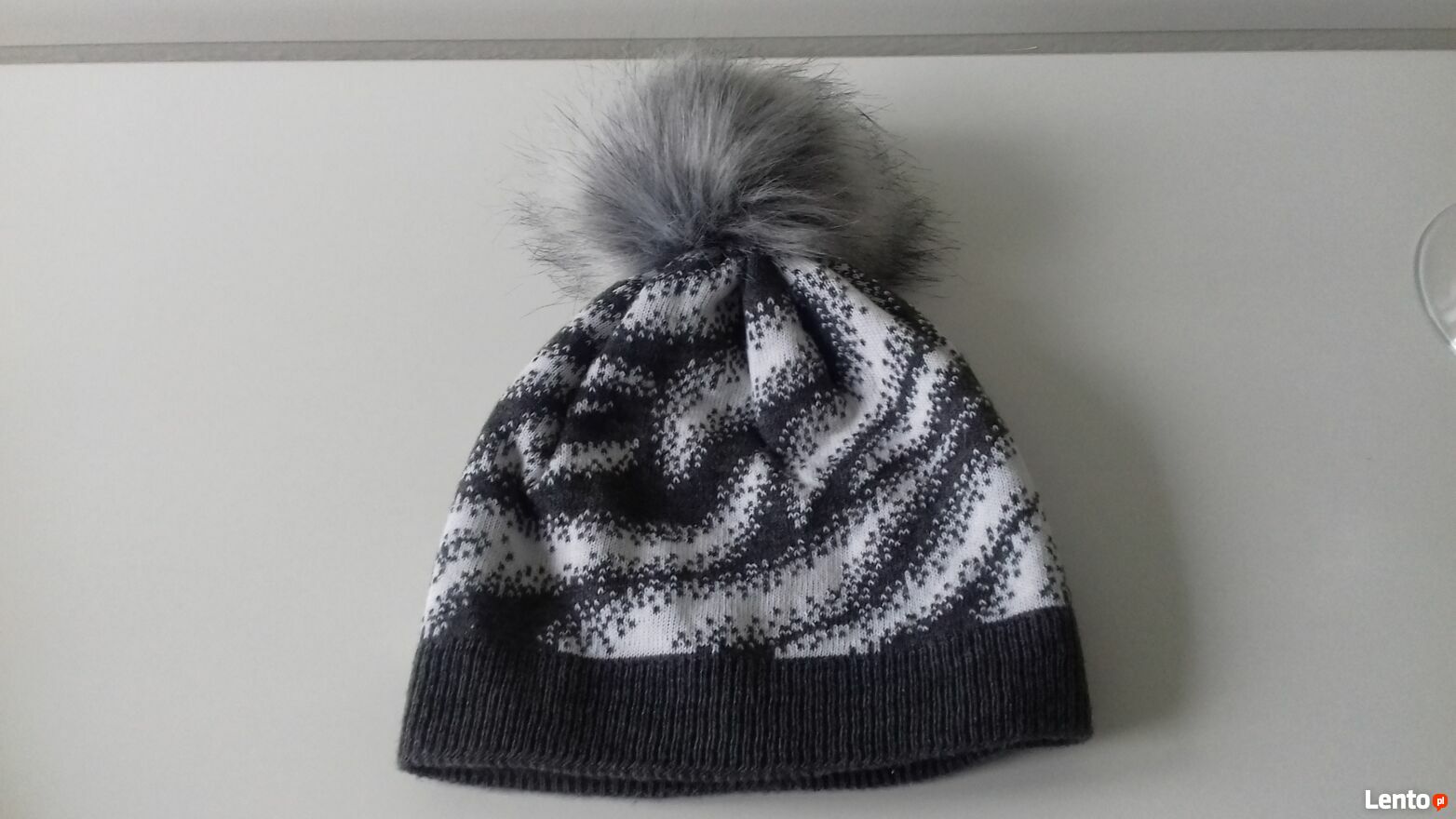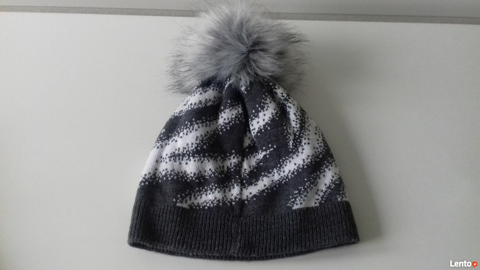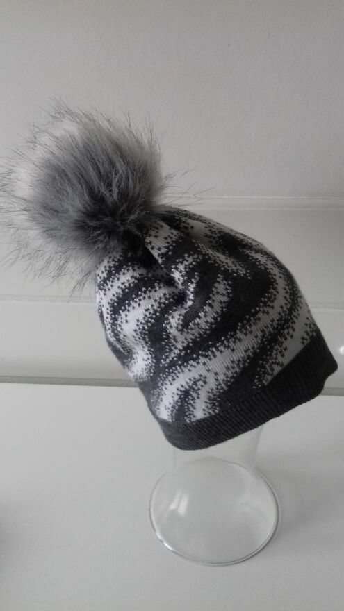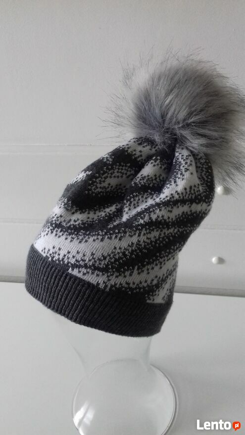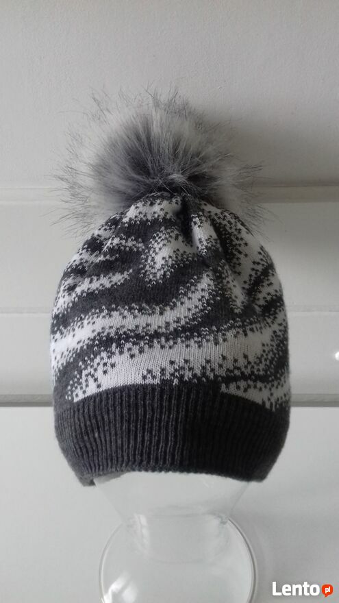 Do sprzedania zimowa czapka damska „Trend Setter” z futrzanym pomponem, w kolorze popielato-białym. Czapka wykonana jest z wysokiej jakości włókna, miękkiego, przyjemnego w dotyku, o grubym splocie. Podszewka z polaru, bardzo miękka, popielata. Wymiary w cm: obwód (min./maks.) – 50/58, wysokość do pompona - 24, pompon - 11. Materiał – 100% akryl. Produkt polski.Czapka jak nowa, prawie nie używana.