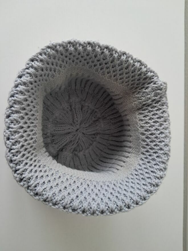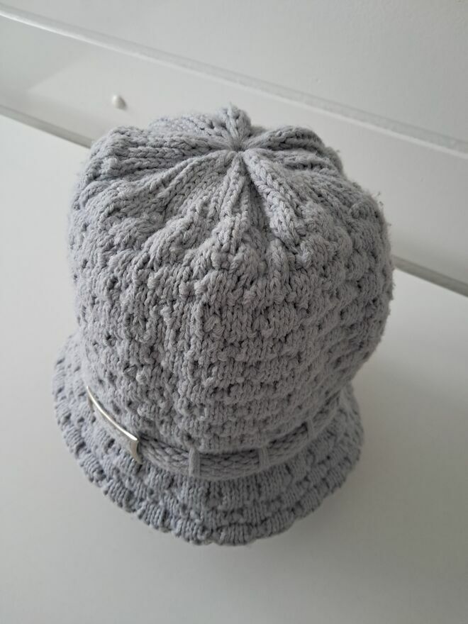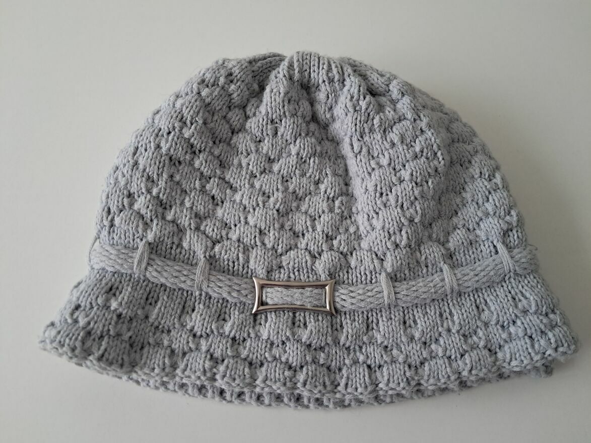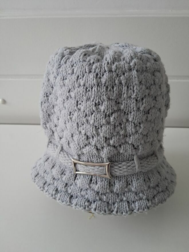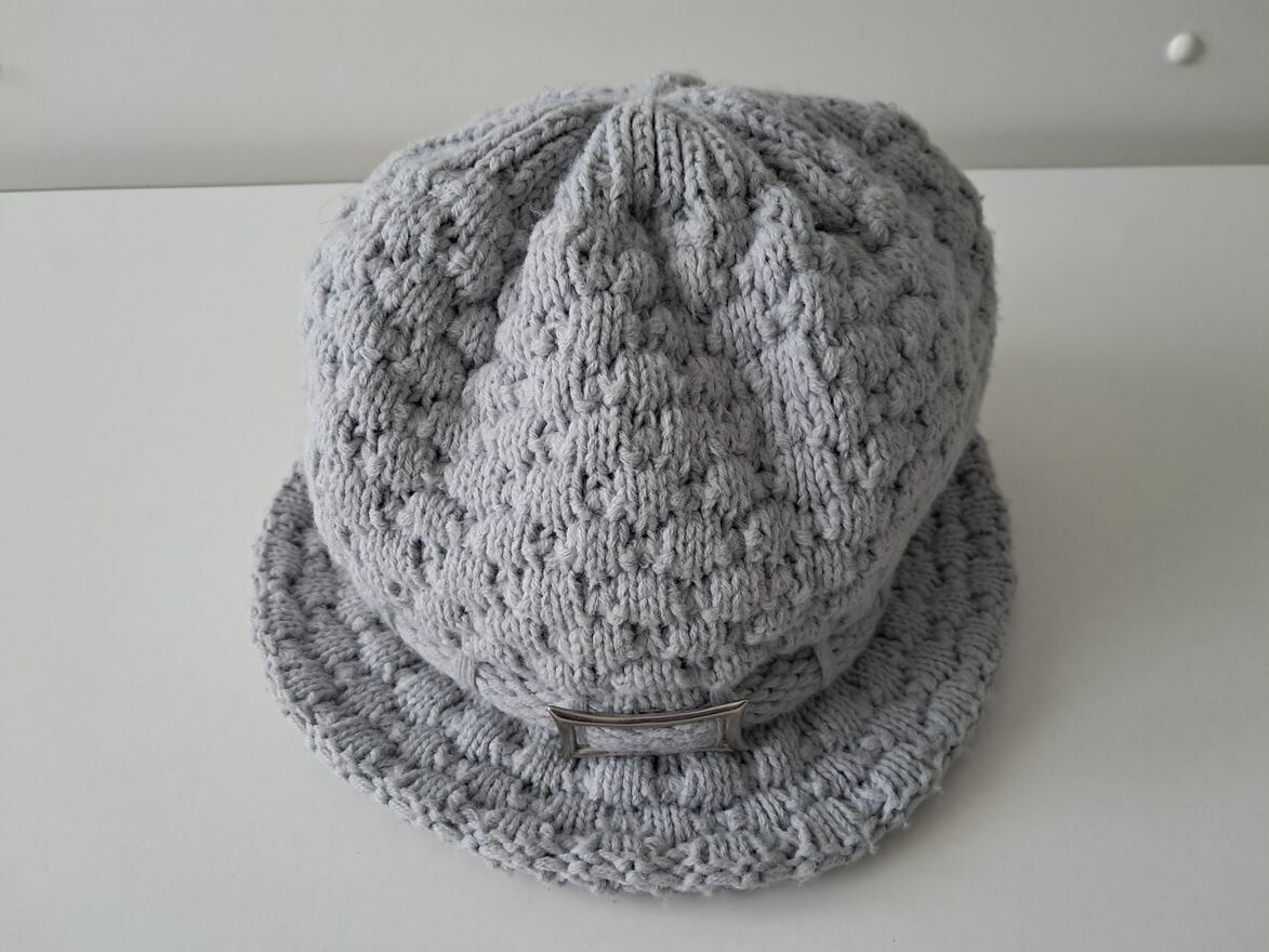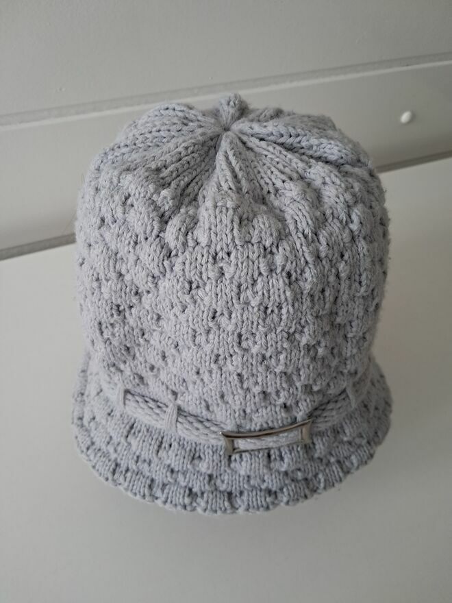 Do sprzedania, miękka i ciepła, zimowa, popielata, czapka w formie kapelusika, wykonana z wełny o grubym splocie, z ozdobną metalową klamerką z boku. Rozmiar 54/56.Czapka mało używana, w bardzo dobrym stanie.