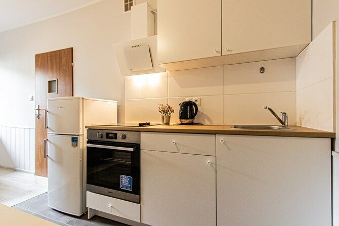 Aneks kuchenny: lodówka, 3-palnikowa płyta elektryczna, piekarnik,