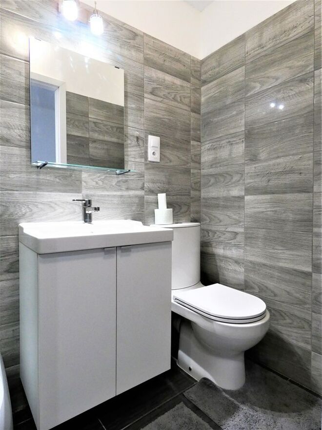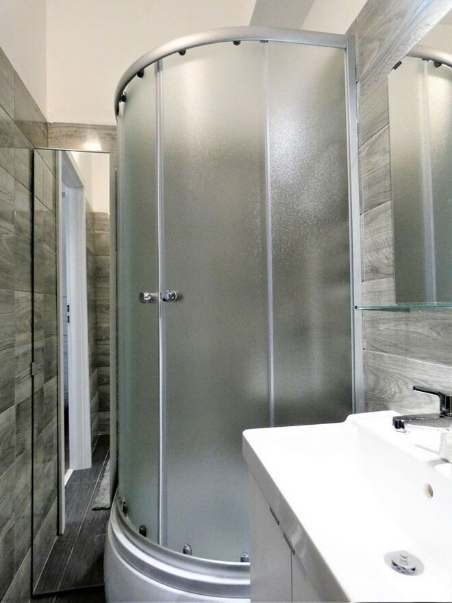 Łazienka: kabina prysznicowa, pralka, umywalka, WC, szafki.