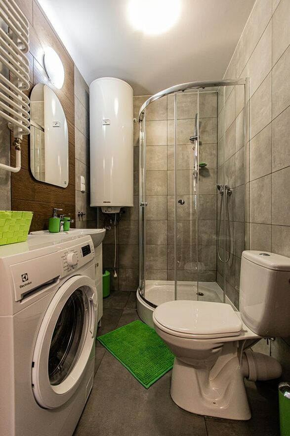 Łazienka: kabina prysznicowa, toaleta, umywalka, pralka.