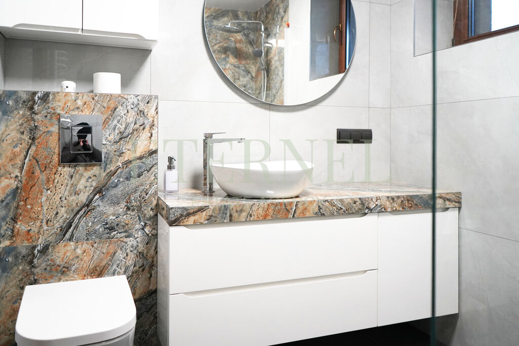 nowoczesna kuchnia połączona z salonem oraz nowa łazienka po
