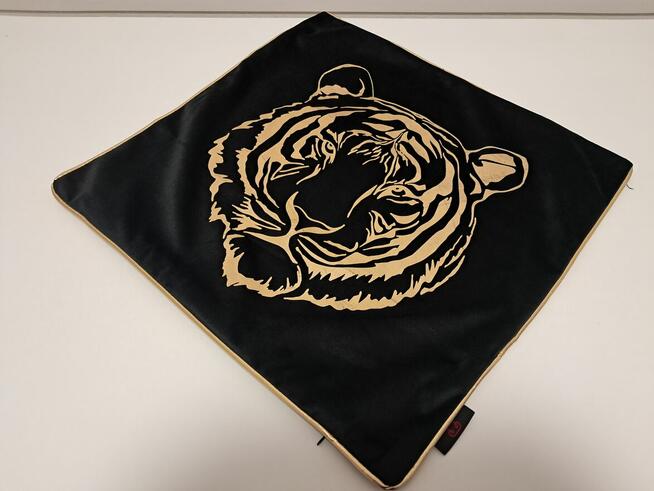 Do sprzedania dekoracyjna poszewka na małą poduszkę, czarna ze złotym wizerunkiem głowy tygrysa (jednostronnie) i ...