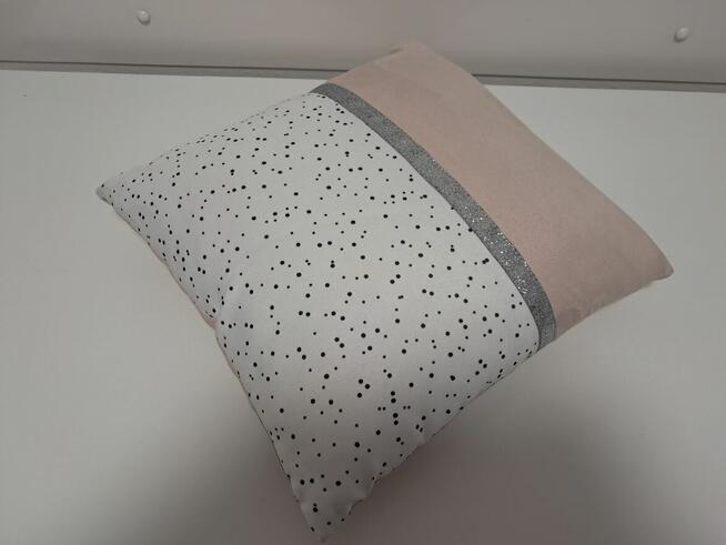 Do sprzedania nowa poduszka dekoracyjna, z jednej strony w dwóch kolorach: pudrowy róż i biały w kropki, rozdzielonych ...