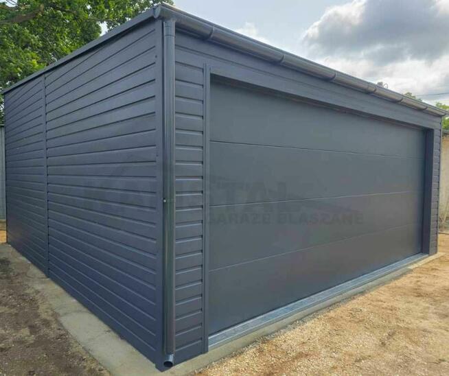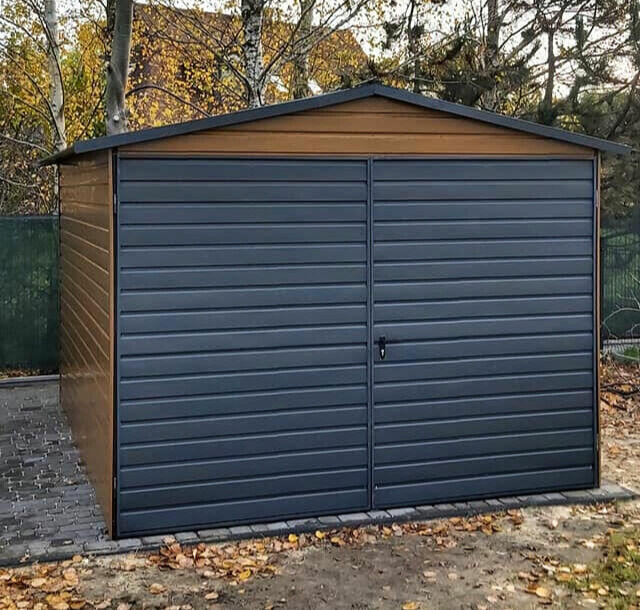 Nowoczesny garaż blaszany 3x5 m – drewnopodobny, z elegancką bramą otwieraną na boki antracytową. Konstrukcja w ...