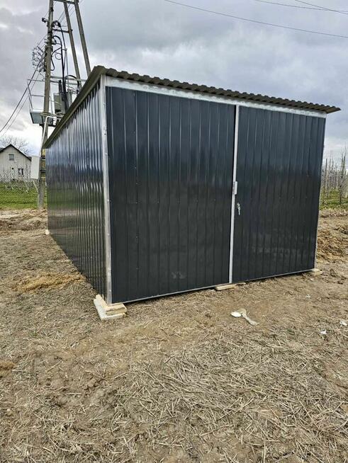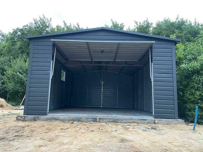 Solidny garaż blaszany 4x6 m z dachem dwuspadowym w kolorze grafitowym i bocznymi drzwiami Konstrukcja w całości ...