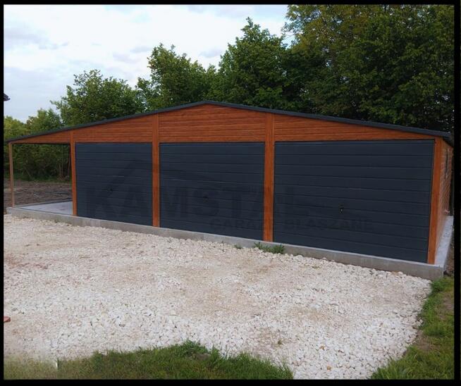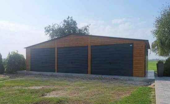 Garaż blaszany o wymiarach 9 × 5 m, w kolorze drewnopodobnym z grafitowymi obróbkami blacharskimi (RAL). Trzystanowiskowy, ...