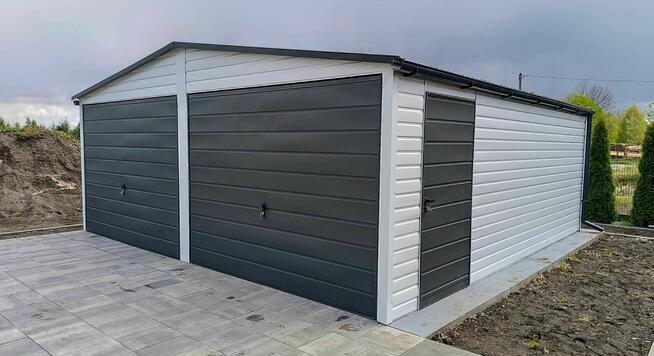 Nowoczesny garaż blaszany dwustanowiskowy 6x5 m – biały z grafitowymi wykończeniami Konstrukcja w całości wykonana ...