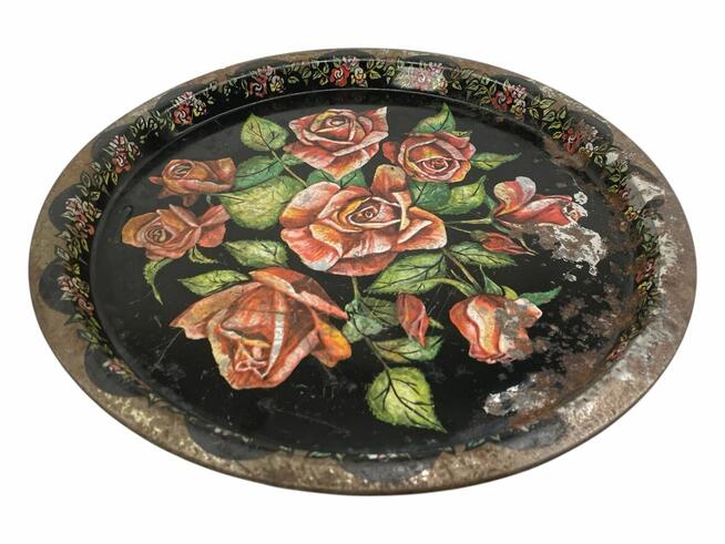 Taca litografowana metalowa – PRL • Motyw: Róże • Kolor dominujący: Czarny • Średnica: 32 cm • Grubość: ...