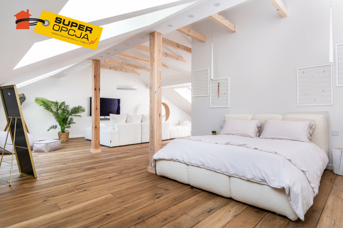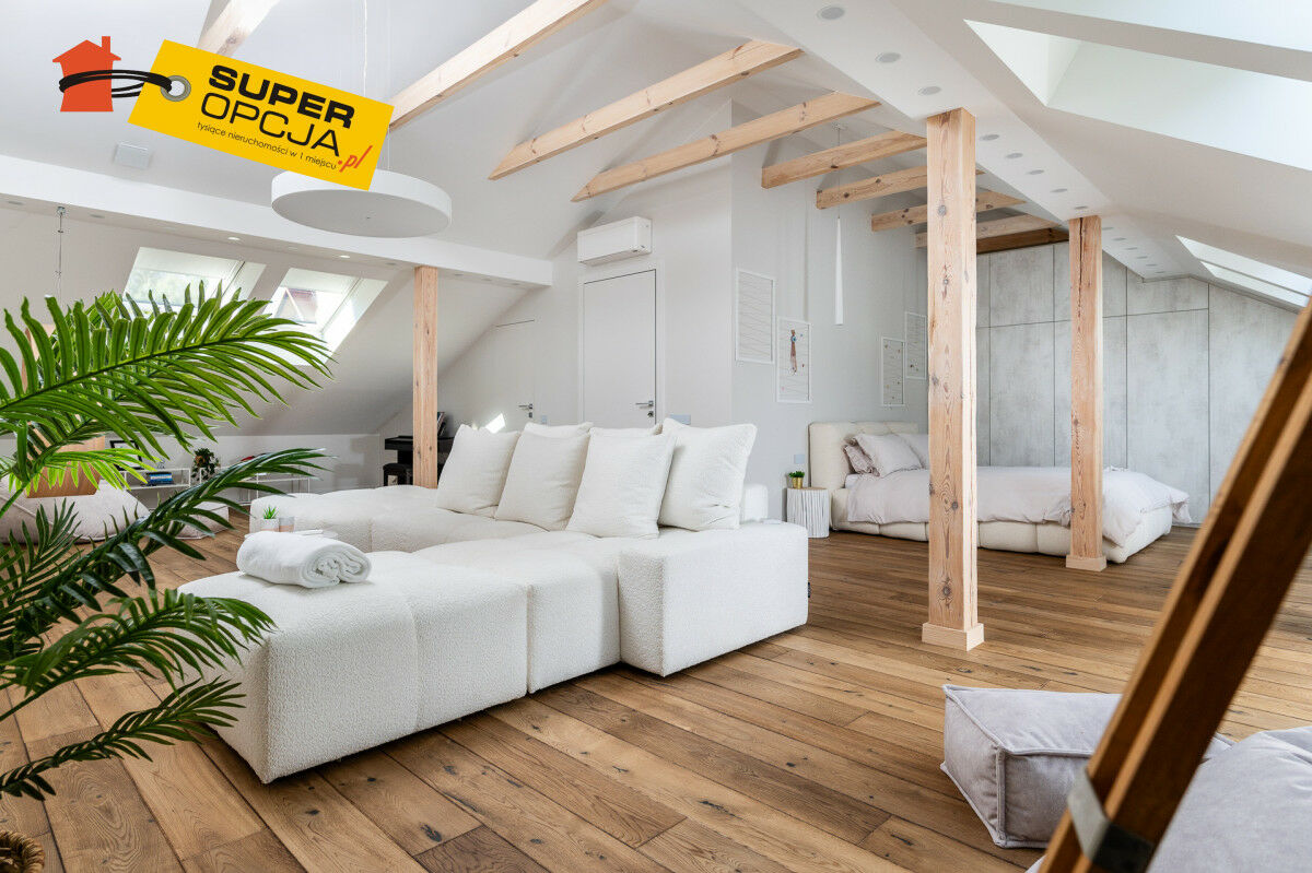 na poddaszu znajduje się open space z częścią sypialnianą oraz pokojem dziennym, oraz dużą łazienką (istnieje możliwość podziału na dwa odrębne pokoje).