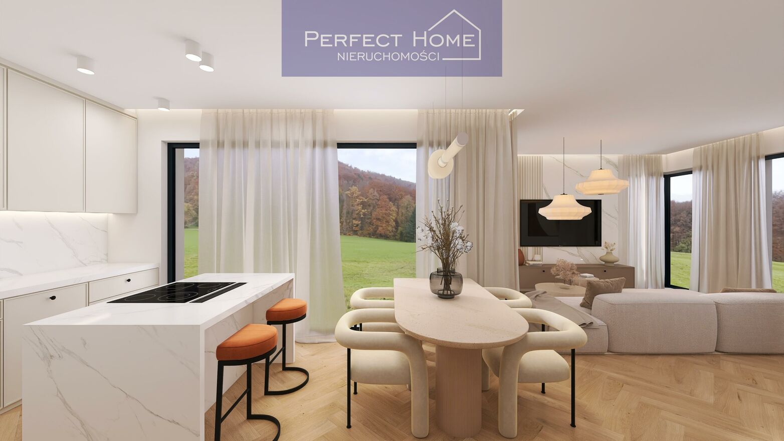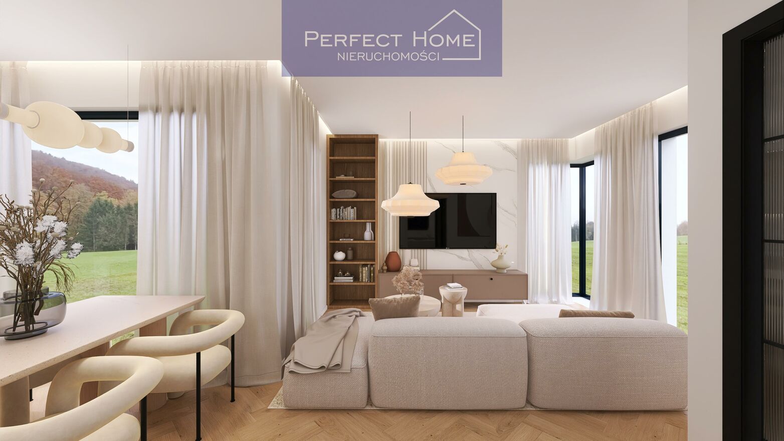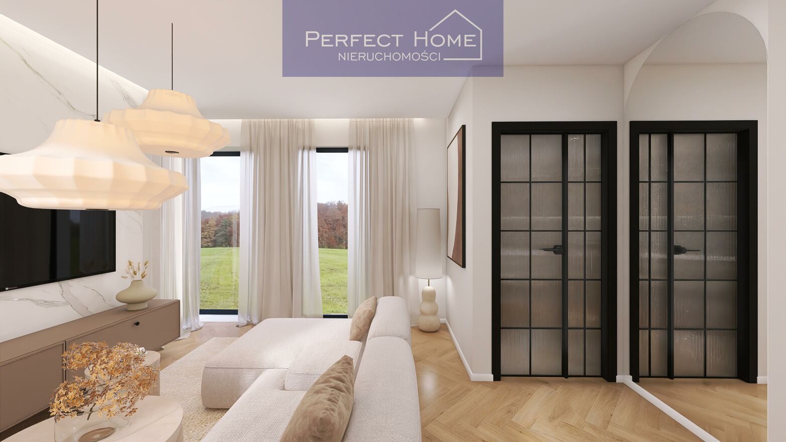 Panoramiczne okna wnętrza wypełnione naturalnym światłem i widokiem na zielone tereny.