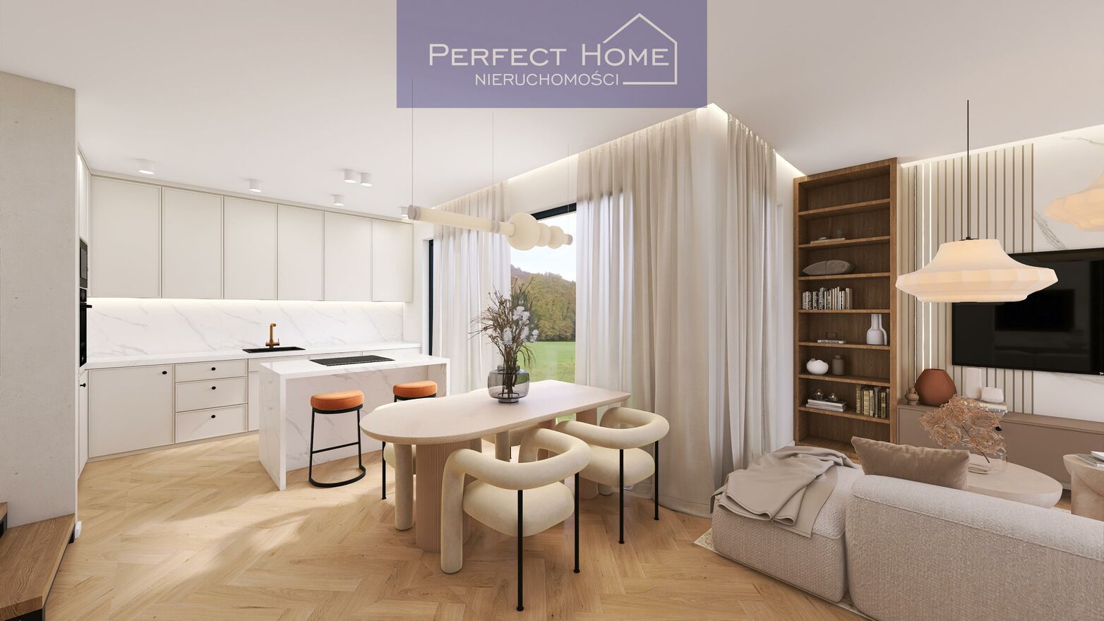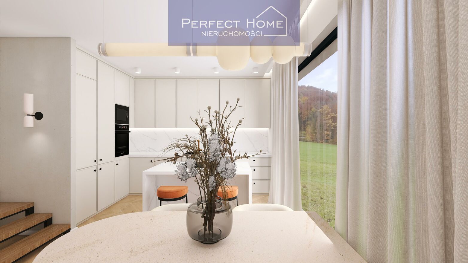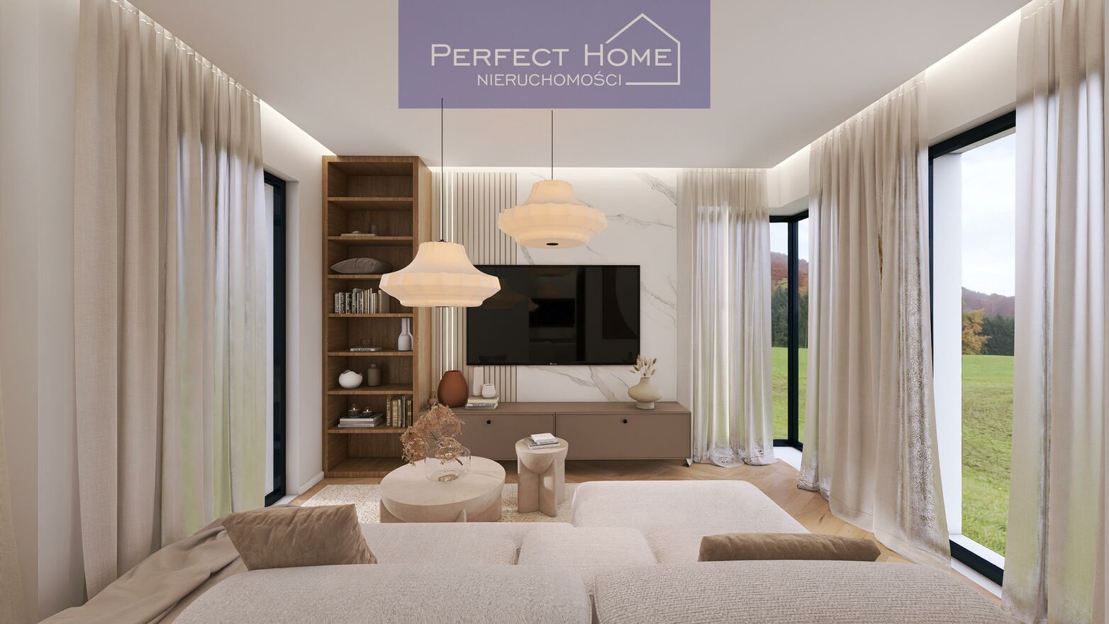 Panoramiczne okna wnętrza wypełnione naturalnym światłem i widokiem na zielone tereny.