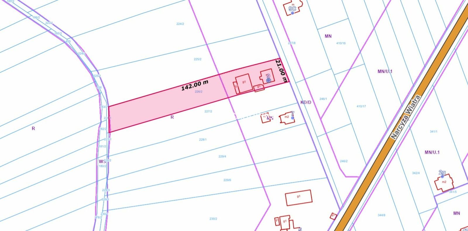 Działka jest objęta ustaleniami miejscowego planu zagospodarowania przestrzennego i składa się z części terenu pod zabudowę mieszkaniową jednorodzinną MN ( 1029 m2 ) i terenu rolnego R (1872 m2).