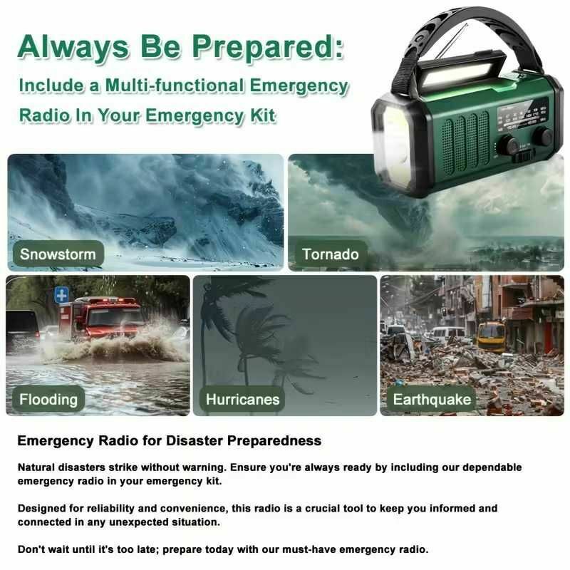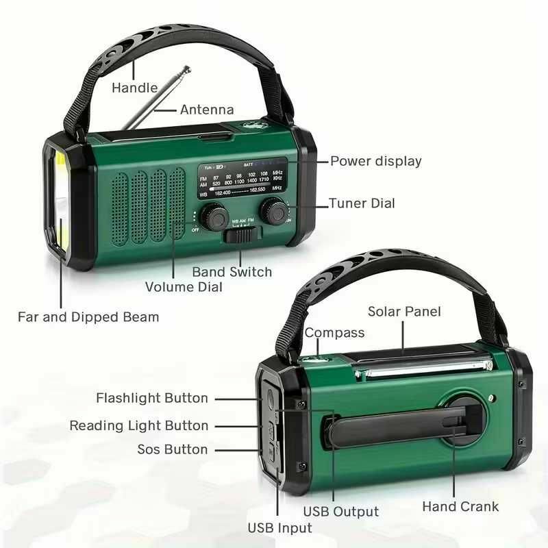 Kompaktowe radio kryzysowe z trzema źródłami zasilania: panel solarny, korbka (dynamo), USB. Wbudowana latarka LED (światło dalekie i krótkie), boczna lampka do czytania oraz tryb SOS. Radio odbiera AM/FM oraz pasmo pogodowe WB. Działa jako powerbank do podładowania telefonu. Na obudowie: kompas, wskaźnik naładowania baterii, antena teleskopowa, wygodny uchwyt.Najważniejsze: