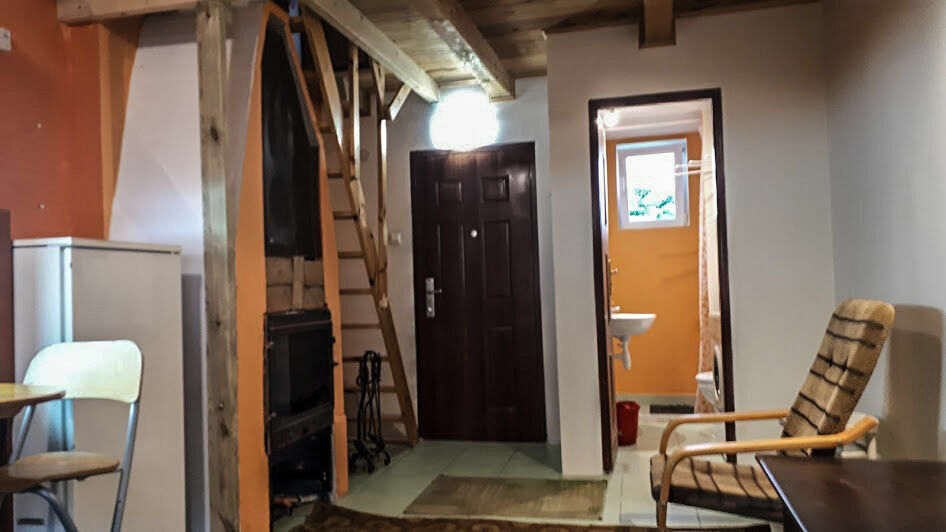 Na antresoli - sypialnia szerokie łóżko i kącik biurowy, na parterze kuchnia, łazienka. Wygodne do zamieszkania 2 osób.