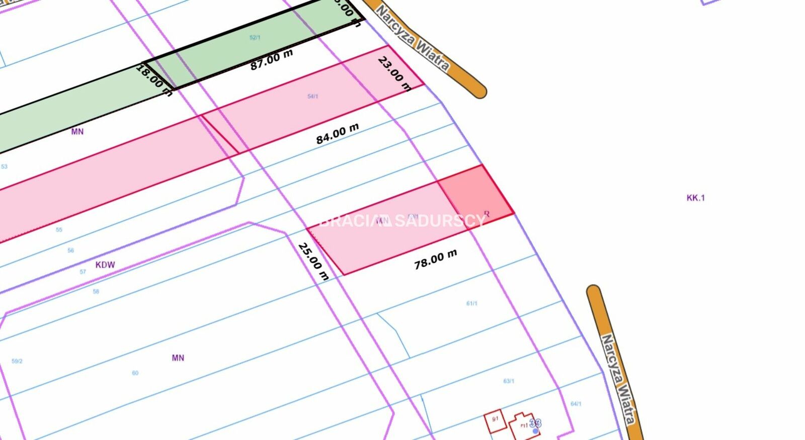 Działka ma powierzchnię wynoszącą 1915 m2 , jest objęta ustaleniami miejscowego planu zagospodarowania przestrzennego i składa się z części terenu pod zabudowę mieszkaniową jednorodzinną MN ( 1409 m2 ) i terenu rolnego R (506 m2).
