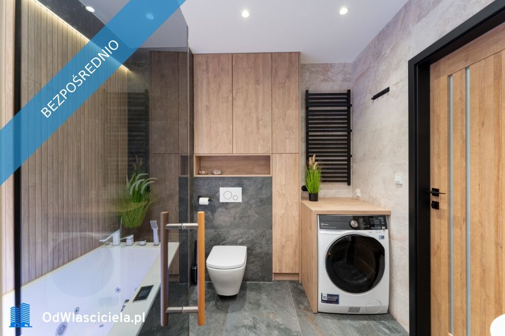 Wanna z hydromasażem (marka Excellent, najwyższy model) z wbudowanymi programami masażu, dodatkowymi dyszami wodnymi, ekranem dotykowym, podświetleniem RGB i funkcją samoczyszczenia. Pralko-suszarka, szafki w zabudowie, wysokiej klasy armatura. Przejście do sauny przez szklane drzwi.