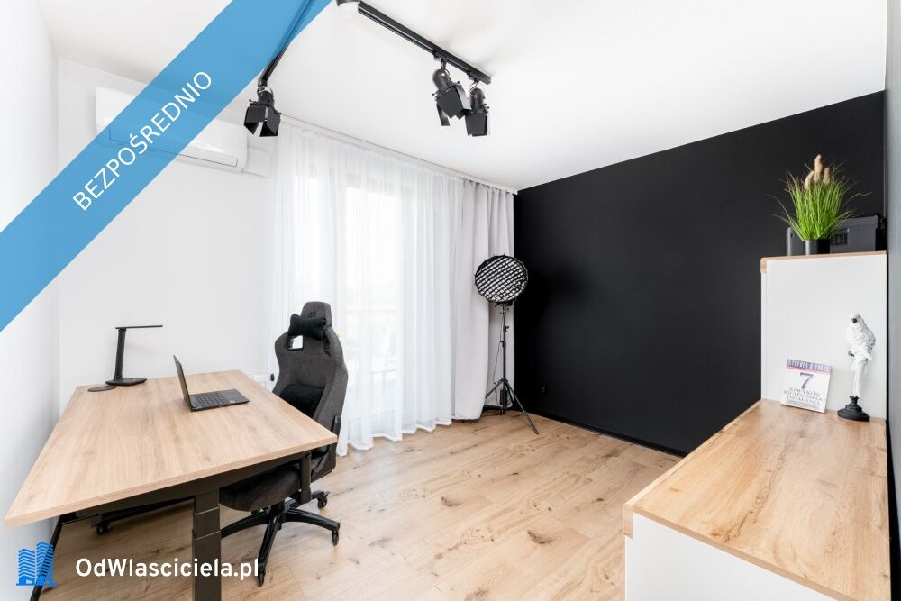 Usytuowany od strony południowej, z dużym biurkiem elektrycznym, meblami na dokumenty. Oddalony od części dziennej – idealny do pracy zdalnej.