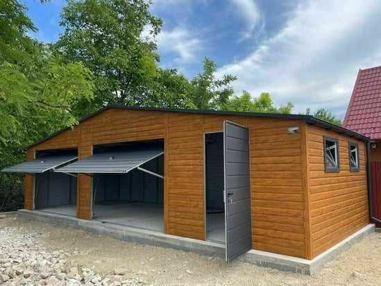 Garaż blaszany o wymiarach 10 × 5 m, w kolorystyce drewnopodobnej (złoty dąb), z grafitową bramą oraz dachem dwuspadowym. Garaż dwustanowiskowy, wyposażony w uchylne bramy.Konstrukcja w całości wykonana z profilu zamkniętego ocynkowanego 30x30.