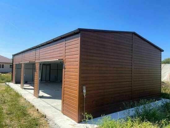 Garaż blaszany o wymiarach 12 × 6 m, w kolorze drewnopodobnym, z brązowym dachem dwuspadowym (RAL) oraz brązowymi bramami (RAL). Dodatkowo wyposażony w system rynnowy.Konstrukcja w całości wykonana z profilu zamkniętego ocynkowanego 30x30.