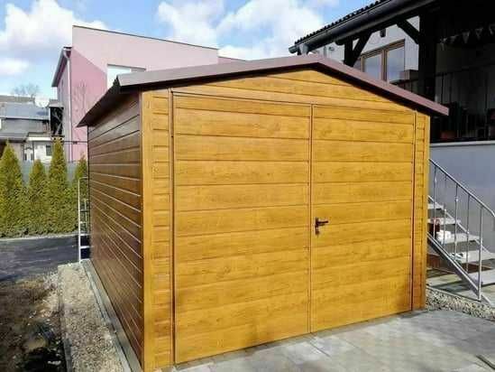 Garaż blaszany o wymiarach 3x5 m w kolorze drewnopodobnymz dachem dwuspadowym i bramą dwuskrzydłowąOkucia boczne i dachowe wliczone w cenę.