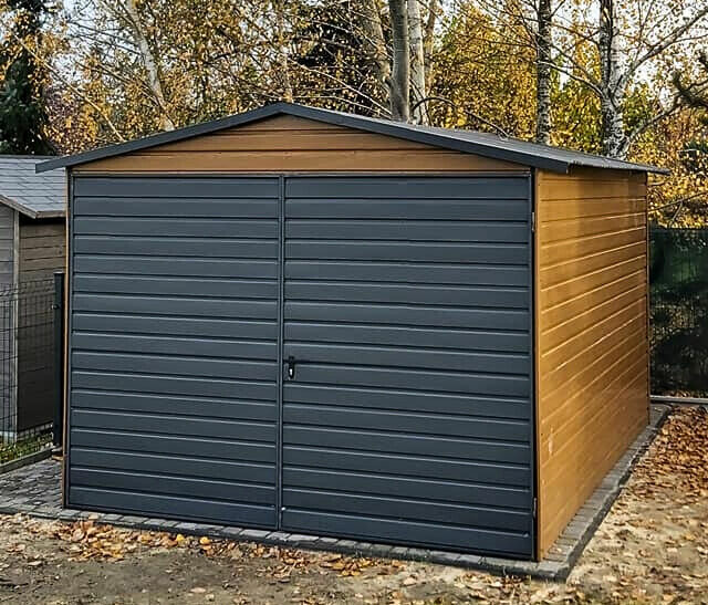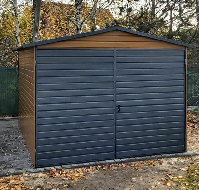 Garaż blaszany o wymiarach 3x5 drewnopodobny złoty dąb z dachem dwuspadowym i bramą dwuskrzydłową w kolorze antracyt.Konstrukcja w całości wykonana z profilu zamkniętego ocynkowanego 30x30.
