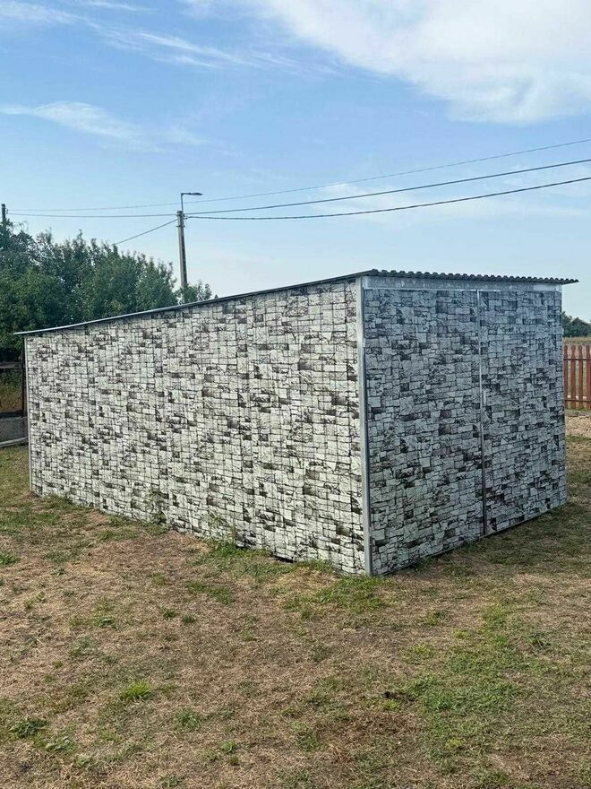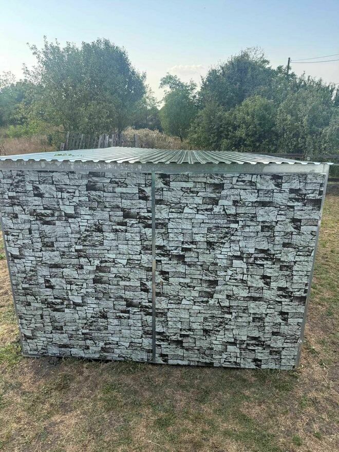 Garaż blaszany o wymiarach 3x5 imitacja kamieniaKonstrukcja w całości wykonana z kątownika zimno giętego 40x40.