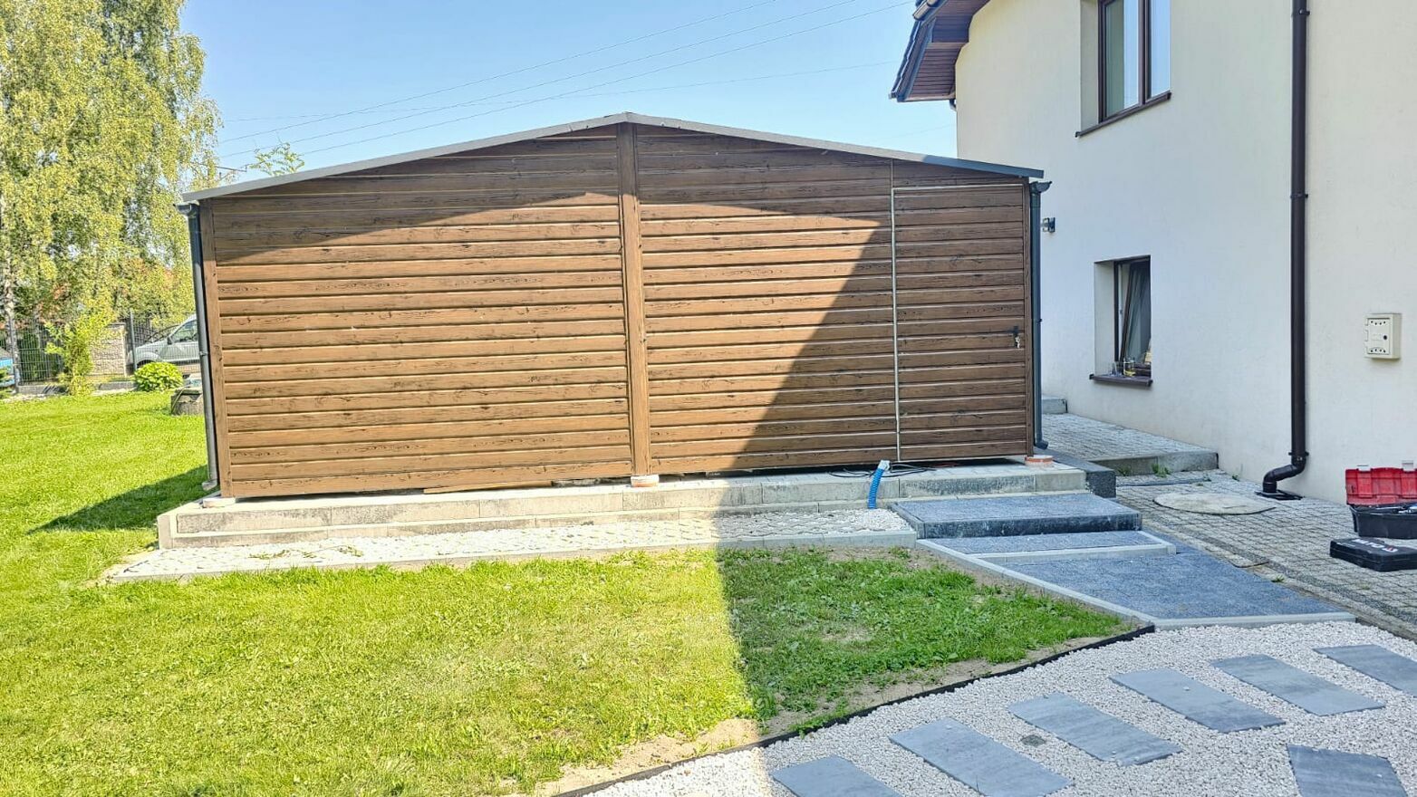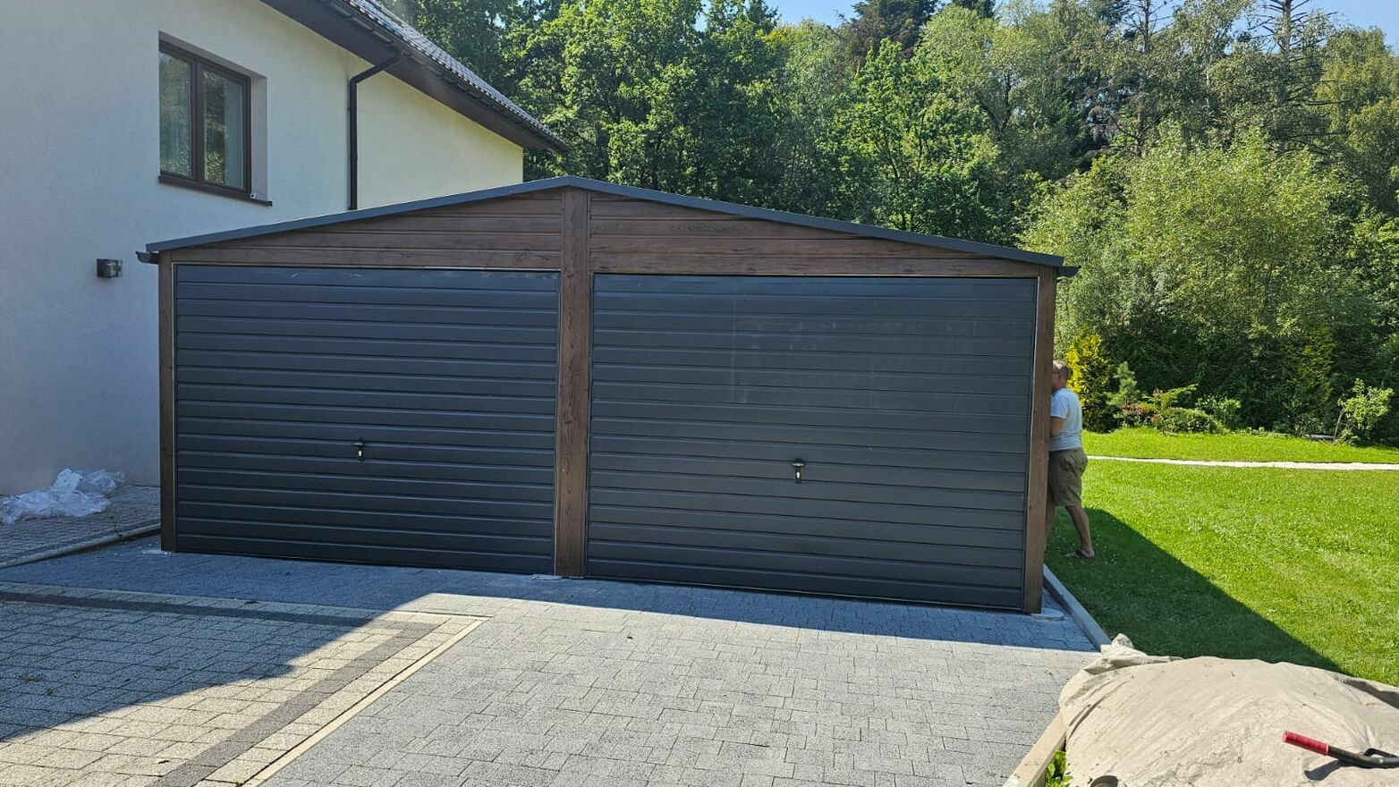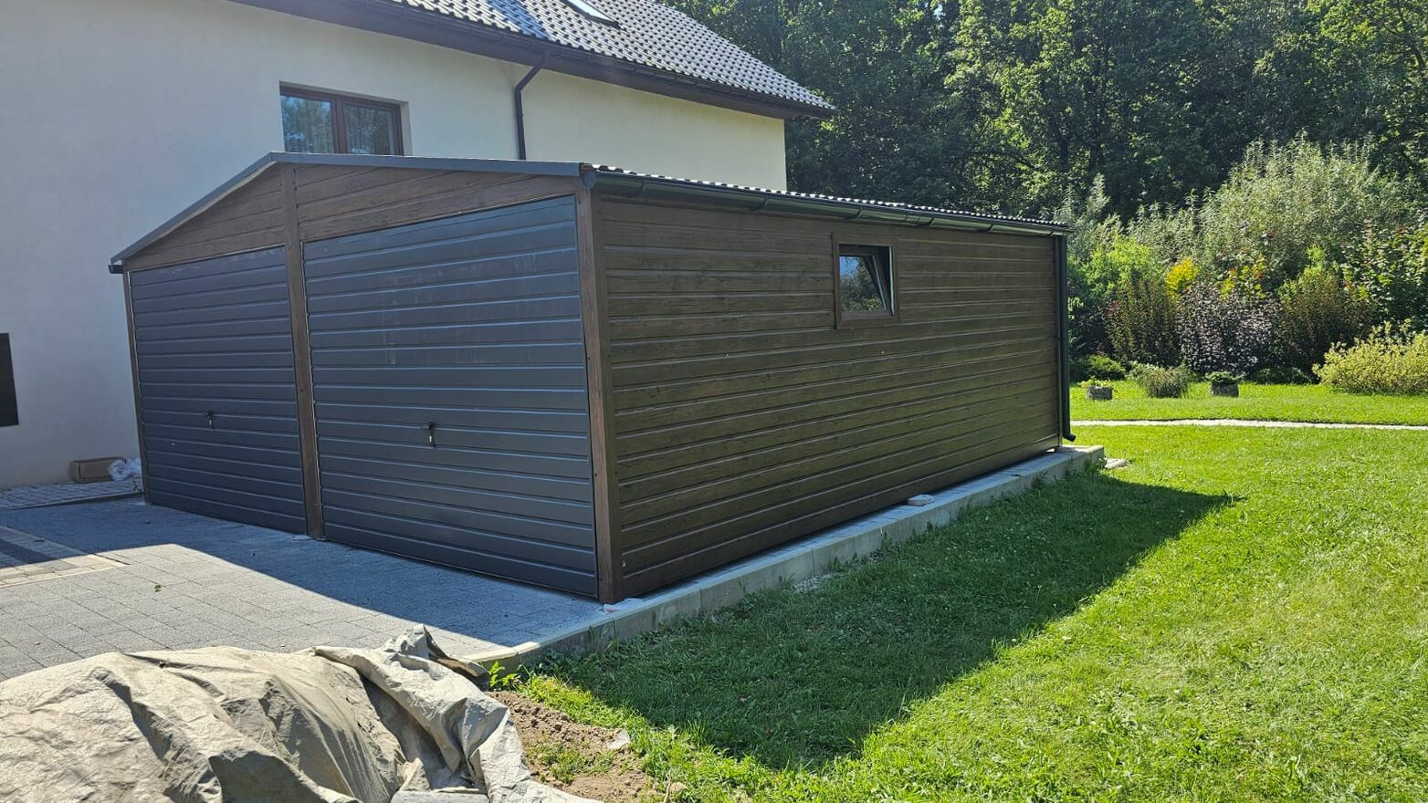 Garaż blaszany o wymiarach 6 × 5,8 m, w kolorze drewnopodobnym (orzech) z dodatkami w kolorze grafitowym (RAL). Dwustanowiskowy, z dachem dwuspadowym, uchylnymi bramami, a także dodatkowymi drzwiami, oknami i rynnami.Konstrukcja w całości wykonana z profilu zamkniętego ocynkowanego 30x30.