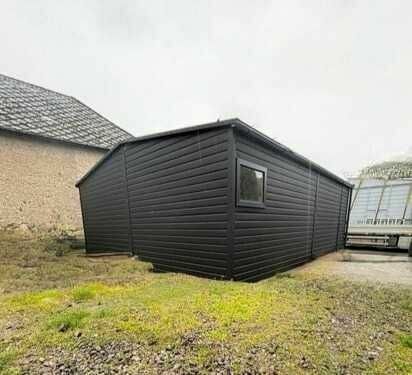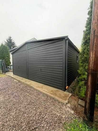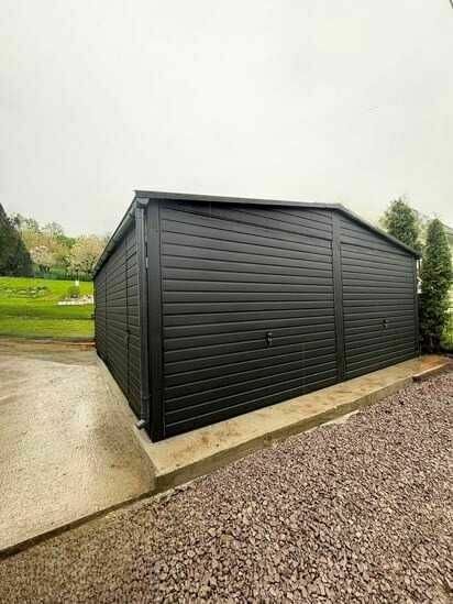 Garaż blaszany o wymiarach 6 x 6 m w kolorze czarnym RAL dwustanowiskowy zamykany bramami uchylnymi, pokryty dachem dwuspadowym.Konstrukcja w całości wykonana z profilu zamkniętego ocynkowanego 30x30.