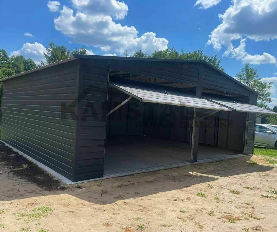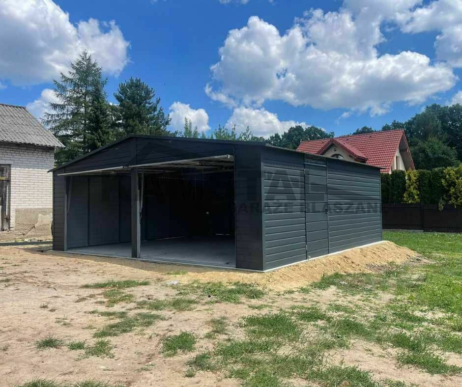 Funkcjonalny garaż blaszany 7x6 m, dwustanowiskowy, w grafitowym wykończeniu z dachem dwuspadowymKonstrukcja w całości wykonana z profilu zamkniętego ocynkowanego 30x30.