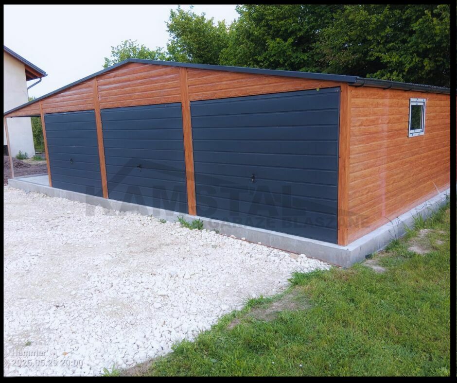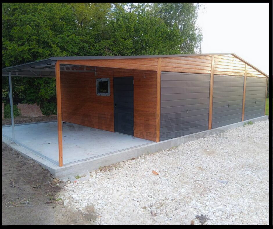 Garaż blaszany 9x5 drewnopodobny trzystanowiskowy + wiata 3x