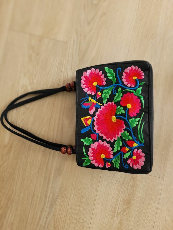 Haftowana torebka damska z motywem kwiatowym. Użyta kilka razy, w idealnym stanie.Wymiary: 28x19x9 + uszy 22cm.